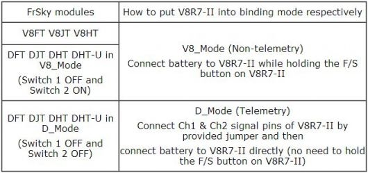 Compatible with all FrSky modules (V8_mode & D_mode) receive only (V8R7-II can talk with module of either mode but it does not send telemetry information back to the transmitter).